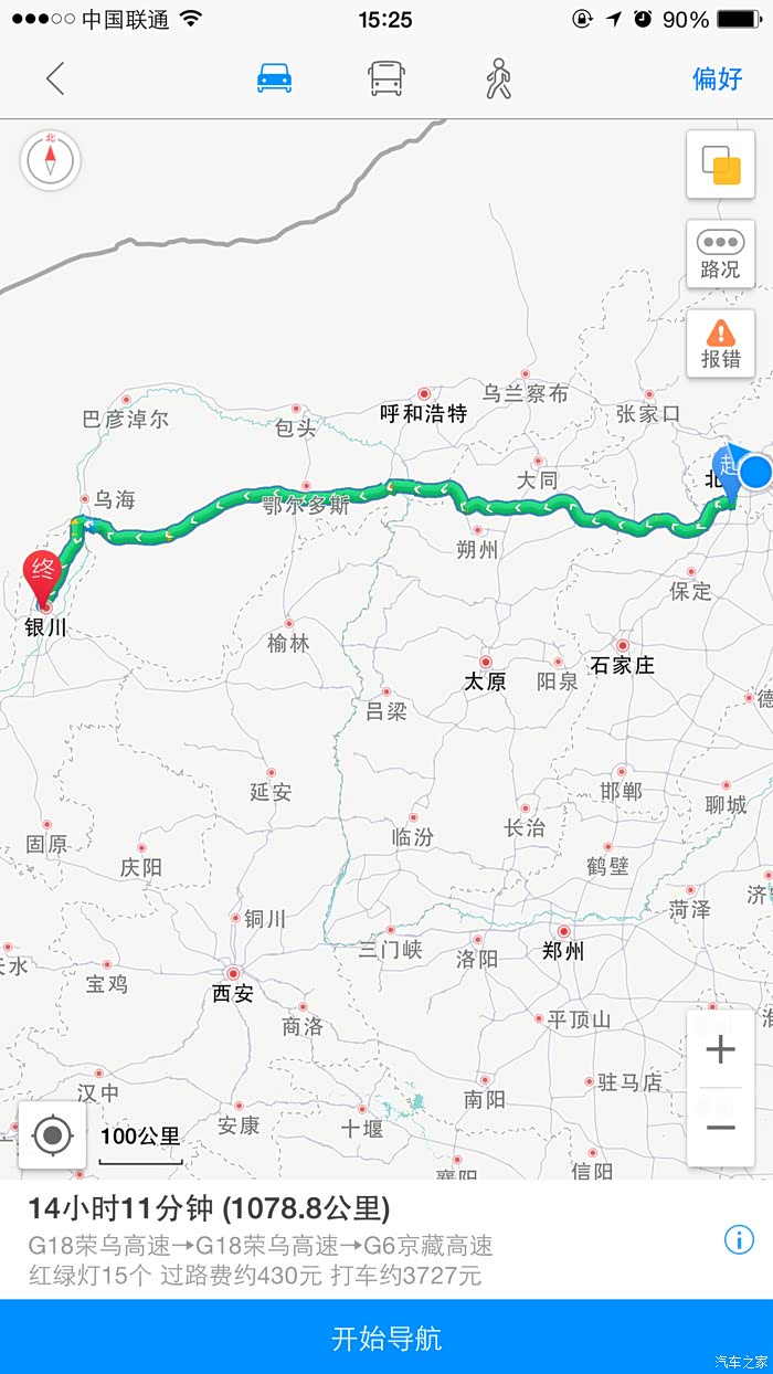 导航路线,导航显示1078公里,实际路线公里数基本和导航一致。