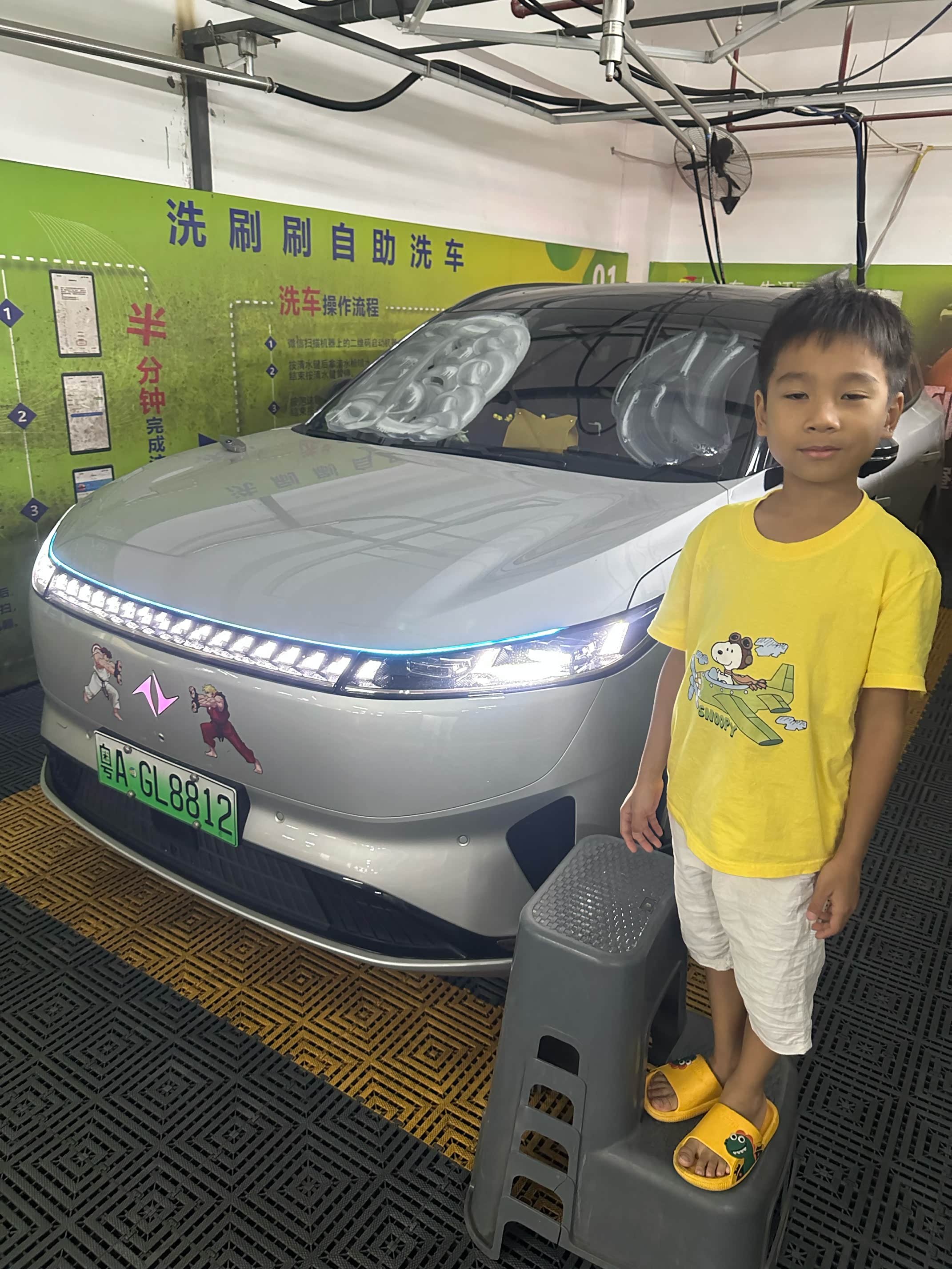 驱车十分钟就到了自助洗车点,蓝色的遮阳棚下整齐排列着八个洗车位,每个车位前都竖着一根高高的水枪,旁边挂着泡沫枪、洗车手套和吸水毛巾。小宇像只刚出笼的小鸟,蹦蹦跳跳地跑到机器前,研究起上面的按钮:“爸爸,这个‘清水’‘泡沫’‘吸尘’是干嘛的呀?”我还没来得及解释,他就好奇地按了一下“泡沫”键,结果高压泡沫“唰”地一下喷了出来,正好打在他的额头上,瞬间冒出一团白色的泡沫,像顶了个棉花糖帽子。小宇愣了两秒,随即笑得直不起腰,抹了把脸,泡沫却蹭得满脸都是,活脱脱变成了一只“小花猫”。