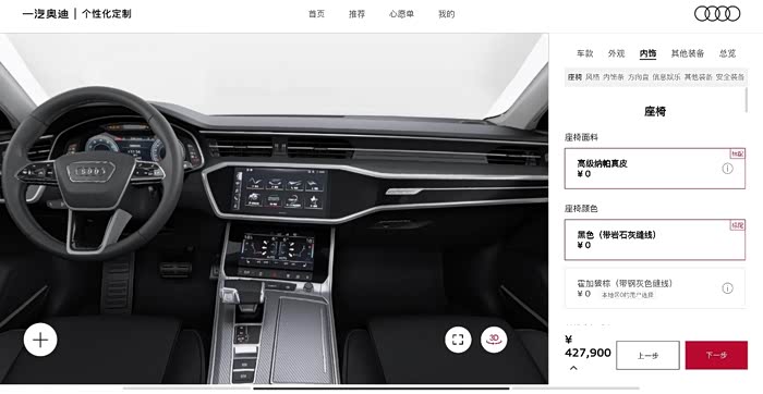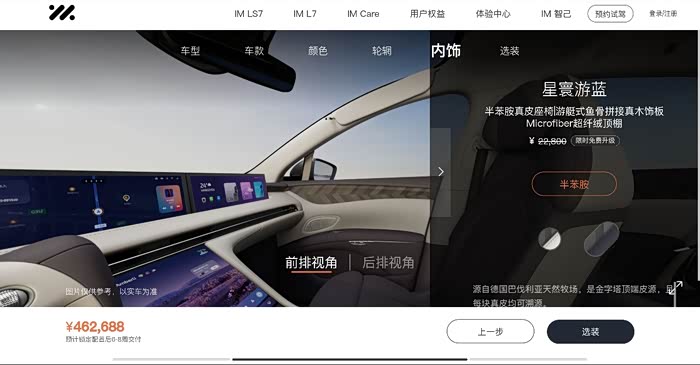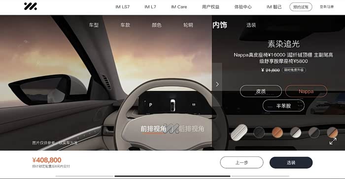 智己L7目前在售3款内饰:素染追光、秘境逐黑、岩魔寻棕,翻译过来就是白、黑、棕三种颜色,另有三种混搭内饰,共计6种风格。材质方面有皮、NAPPA、半苯胺三种质地的真皮。目前基础款售罄,但是可以限时免费升级NAPPA,这白捡的便宜相信没人会嫌弃。升级半苯胺目前优惠价是9800元。我是去年双十一锁单,升级NAPPA需要加价1888元,半苯胺与现在相同是9800元。