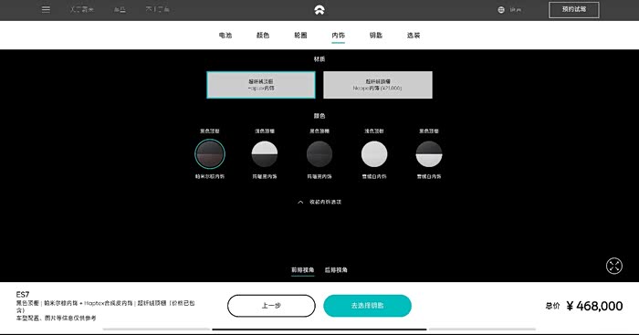 蔚来ES7有棕黑白三种风格内饰,搭配黑白两种风格顶棚,共有5种内饰风格。材质分为haptex和NAPPA两种。Haptex为标配,选装NAPPA的话需要花费21000元。ES6上甚至超纤绒顶棚还需要6500元,NAPPA皮需要25000元。这个价格对大多数消费者而言,真的需要掂量掂量。
