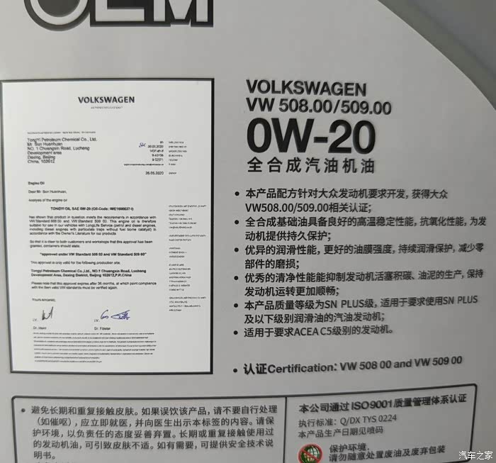不是符合、超越等,而是通过了vw508认证,背面附带认证证书,适用于要求C5的车辆,说明灰分不高于0.8