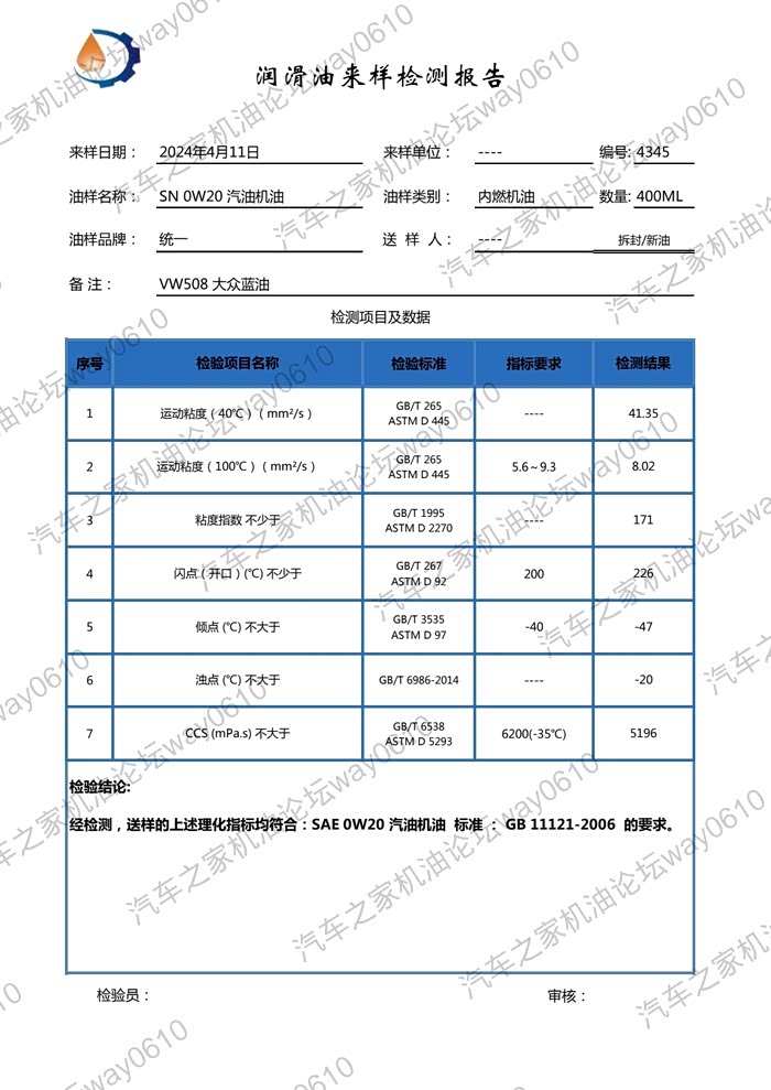 机油送检第545篇-统一OEM大众0W-20 vw508蓝油