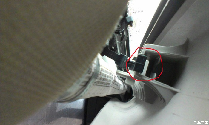 这货的A柱不好拆,红圈位置这个卡套,半天没拿出来,不敢使劲,见里边反正没安全气囊,经车主同意,就没取出来,直接把线塞进去了(其实他能不同意么,不同意你自己来装回去好了),而且这货的A柱好像就是纯塑料的,上面没有蒙一层绒布,摸起来比上边两个手感要差多了