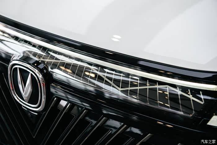 硕大格栅,以长安车标为中点,“V”形饰条由细至粗、由柔至刚,一圈圈往两边荡漾,像极了巨鲸身体刚入海后,暂留在海面的尾鳍。