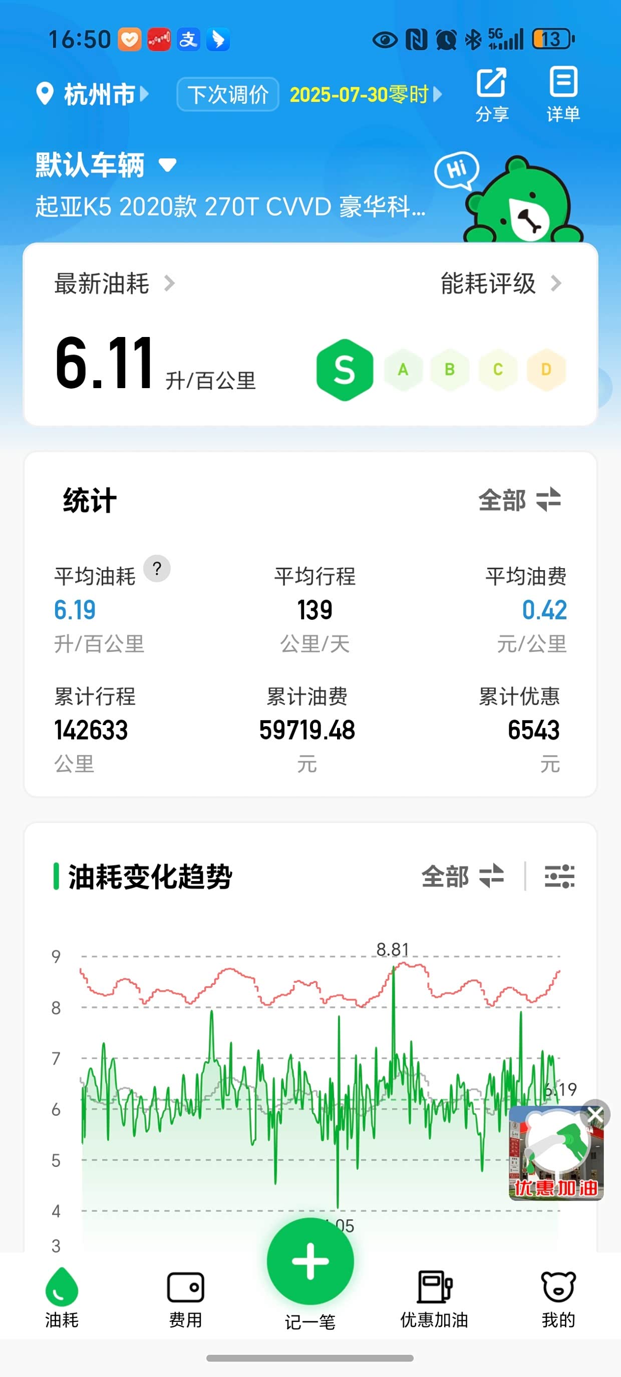 先来说说这个车的优点,首先就是省油!这个车的油耗在纯油车里算是很省油的车之一了,我20万公里开下来的平均油耗是6.2升/百公里,总共油费花了8万多一点点,合计成本是4毛钱/公里。最高油耗是8升多/百公里,这是在夏天开空调在市区拥堵路段走走停停跑出来的,最低油耗是4升多/百公里,这是在春秋天高速上匀速100公里/小时的路况下跑出来的。跑长途高速,通常一箱油能跑1100公里。省油的秘诀首先是这个发动机技术比较先进,用的CVVD技术,使得1.5T的小排量发动机有170马力,253牛/米,油耗确只有6升/百公里。还有就是K5这个车重量比较轻,整备质量只有1.47吨,比同级的竞争对手都轻,后来我把4个轮毂换成了锻造的轮毂,质量又减重了20公斤,备胎工具等放家里,油箱只加半箱油,电瓶换了个锂电瓶,这样合计下来整车质量又减重70公斤。再有就是我的驾驶习惯是尽量省着开,空调不到30度以上的大热天就不开,开窗通风就行,轮胎换用低滚阻的新能源专用轮胎,气压打到2.8Pa,机油用最好的美孚1号0W-20,尽量避开拥堵路段,能走高架路就不要走地面,不要急加速和急刹车,路上遇到红绿灯,提前加减速。这么一顿操作下来,油耗就控制在6个左右。