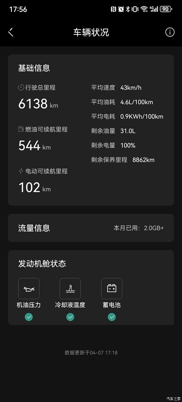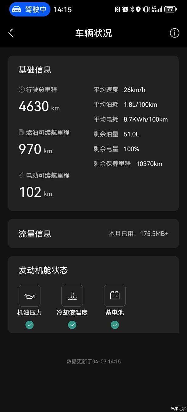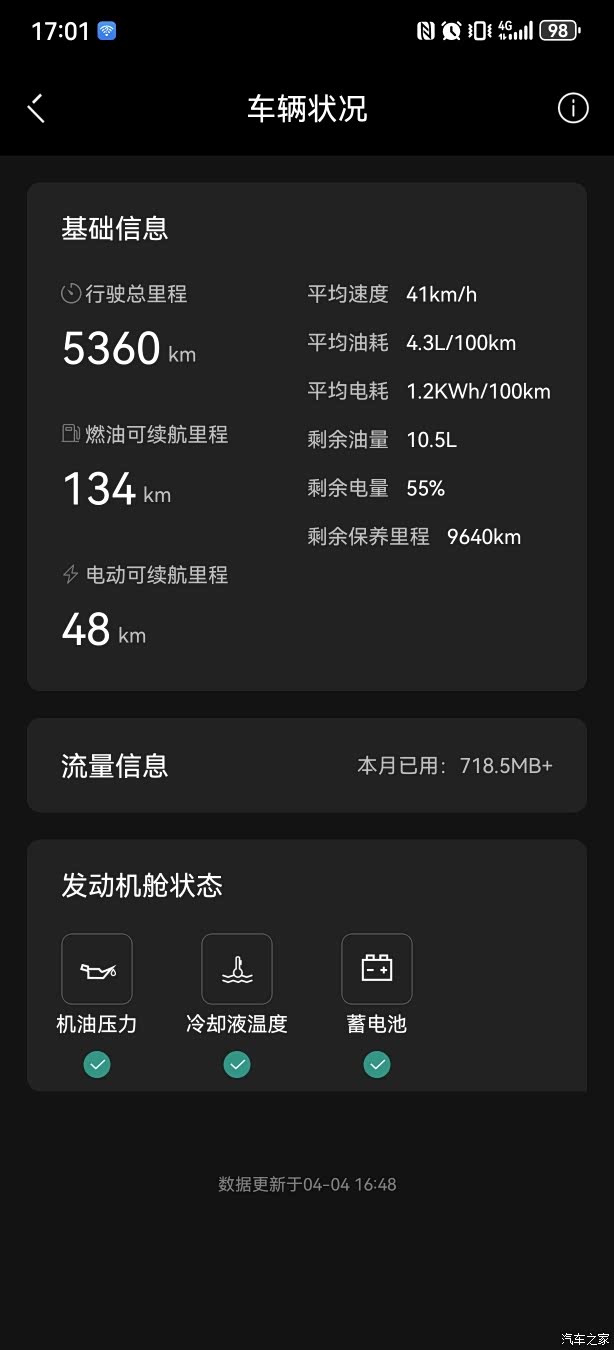 4月3号出发时满油满电,车上2个人。由于一路上非常堵车,4月4号下午才到目的地,到的时候跑了730公里,51升油剩余10.5升,电量开了智能保电还剩55%也就是10.45度,另外在半路上有充过10度电。