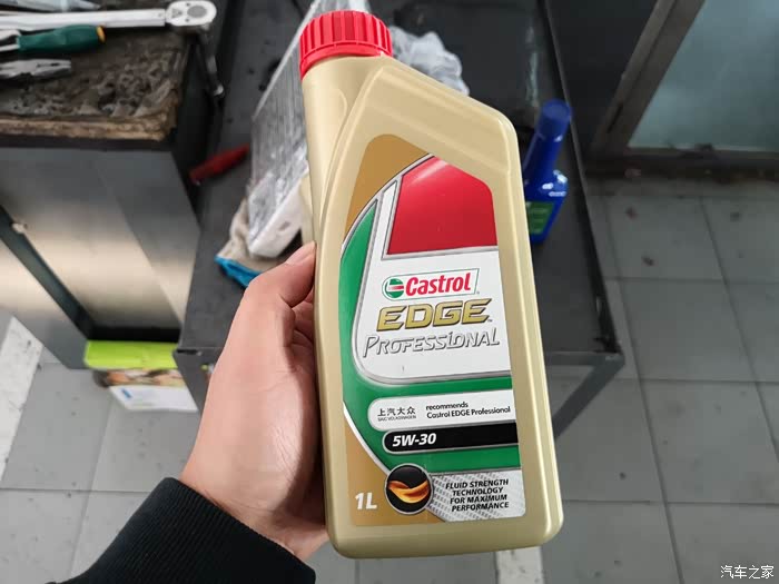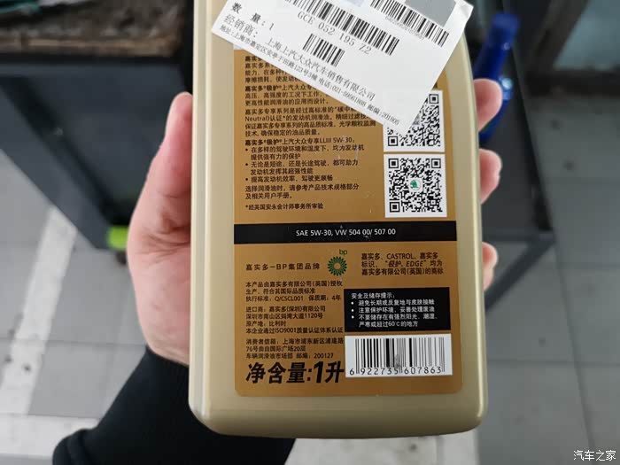 4S送的基础保养是包括基础机油(204元白桶Z4半合成机油),原厂机滤,放油螺丝一套,工时。玩机油论坛的怎么可以用4S原厂半合成5w40 SL级的机油呢?于是土人自带了618屯的4L上汽大众嘉实多极护专享5w30机油(某猫旗舰店100元1L屯的,当时为了一嗨租车的1000元租车券才买了4L极护专享和4L胜牌尊选)这次保养是在去年10月下旬做的,到发帖为止这一锅油已经跑了3500公里,使用的感受我放在文末吧!下面给大家看看上汽大众4S店保养的过程。