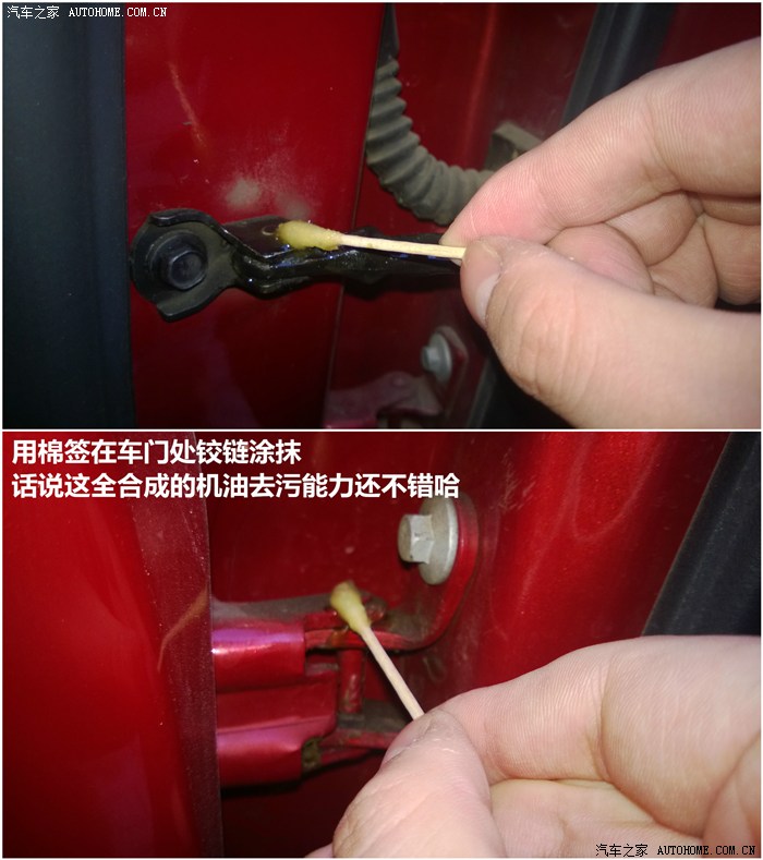 以前车门开关沉重,还伴有吱吱的异响,去4S保养的时候跟工作人员反映,在保养结束后发现车门铰链上给抹了一些固体润滑油,原来异响就是这个原因啊。