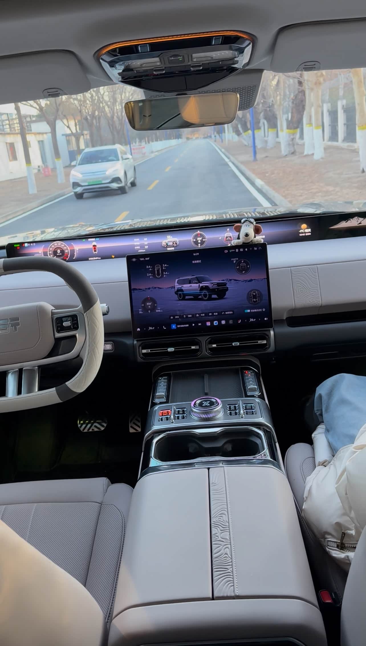 这车停路边,绝对是焦点!方盒子设计,前面大格栅+矩阵灯,线条硬朗得像装甲车,20寸越野轮毂,视觉冲击力爆棚(准备过了年换KO3)。车长超5米2,宽2米,高也将近2米,开出去气场直接两米八,太得劲儿了!