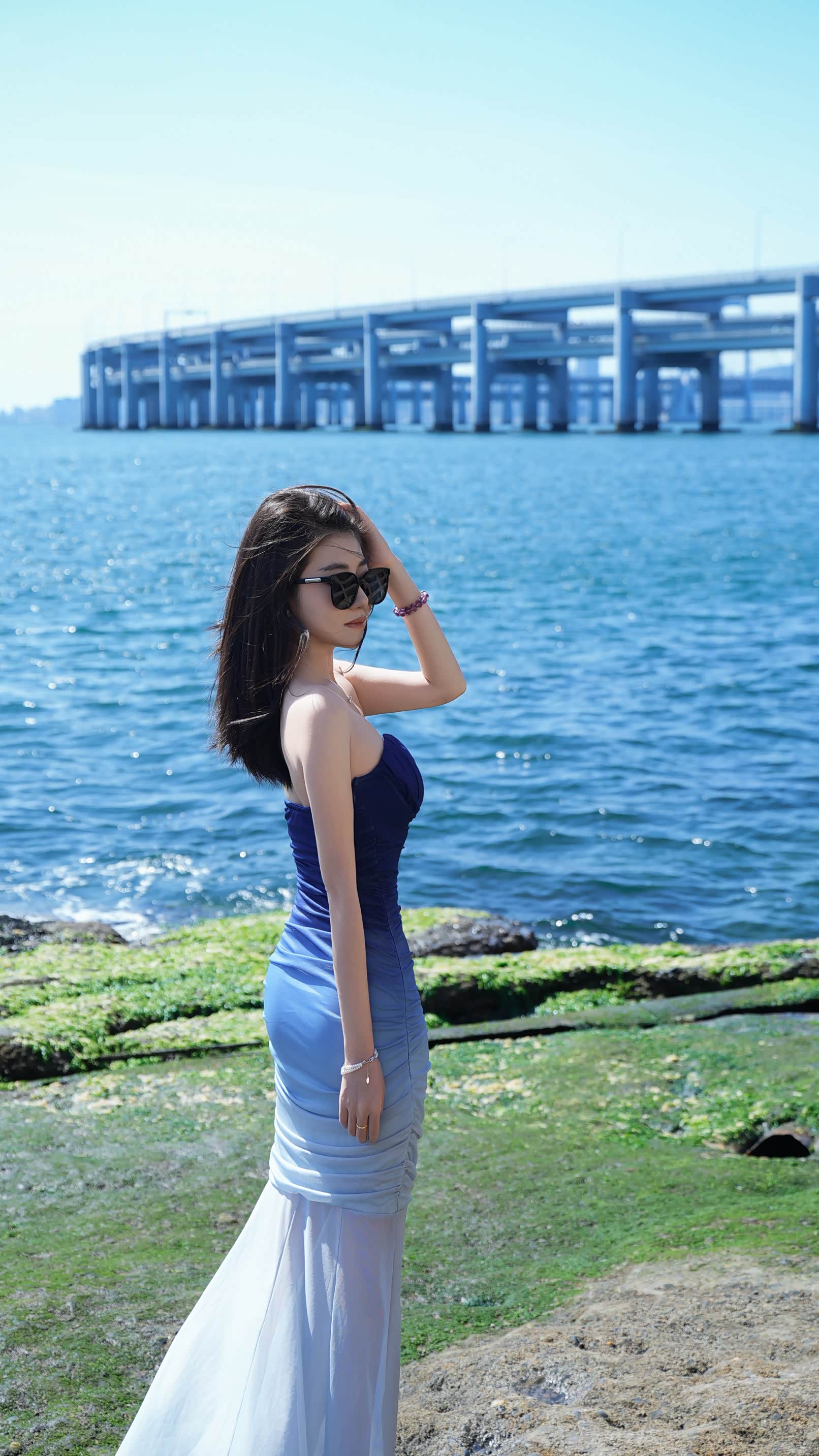 我们先来看第一个模特 这次模特穿的是一套渐变蓝色的抹胸长裙,可以说跟大海太般配了。