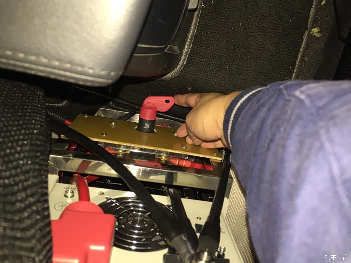 副电瓶和逆变器放在驾驶座后面,驾驶员右手向后伸就可以操作逆变器开关和副电瓶开关,很方便。图中手所指的开关和上面发动机舱的手动开关都是安全措施,不出游的时候全部关上,确保安全。