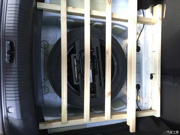 后排座椅是向前倒下,不是反向。如果后面不加木料的话,会有6.5公分左右的高度差,很不舒服,所以我才做这些改动,同时也增加了后备箱盛板的承载能力,睡两个人没问题,板子也不会凹下去了。图中下面的几根木条是开槽嵌入连接的,方便拿取备胎。此图未完工时拍的,一个人改装没有帮手,所以照片少了些,以后补上。