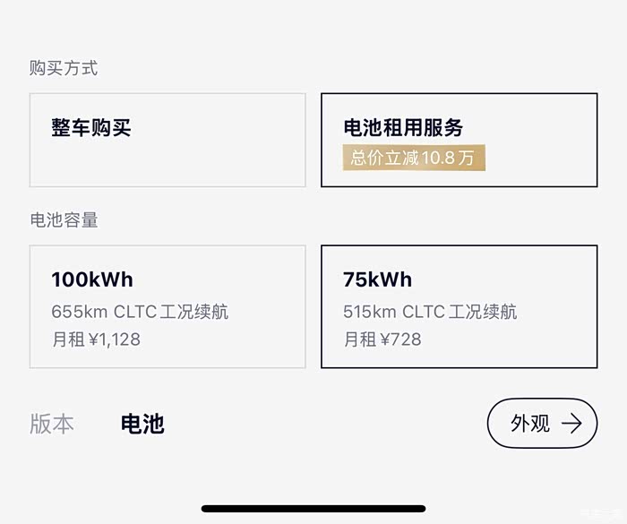 采用电池租赁,毫无疑问就是闭眼冲75kWh电池版本,价格更低,每个月728元,续航也能够满足日常需求,需要长续航的时候,单次直接加50元即可换装100kWh电池,自由选择度很高,100kWh电池租赁每个月需要1128元,这个价格显然没有75kWh的性价比高了,所以你会怎么选择呢
