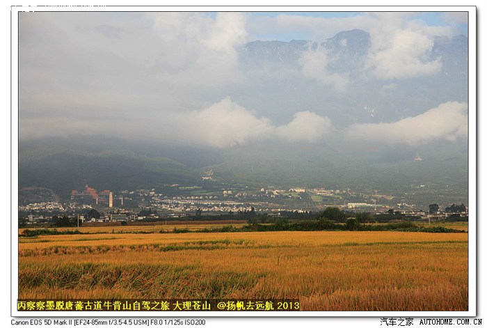 苍山就在洱海对面,我们看洱海,再返回的路上,看着云雾在苍山上缭绕,我们停车隔着黄油油的稻田拍苍山美景,还有山坡上三塔寺的三个塔。(一)