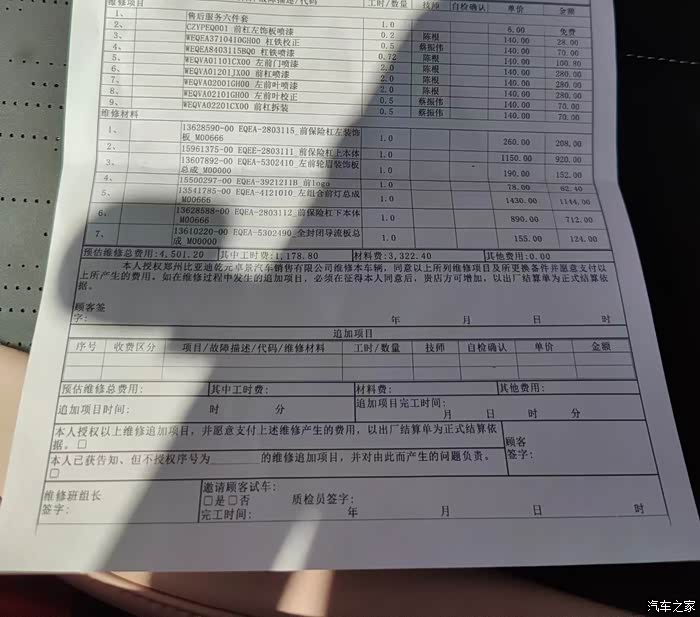大概过了一个多星期吧,服务人员告诉我车修好了,我就去4a店里,看到了他们的维修单。
