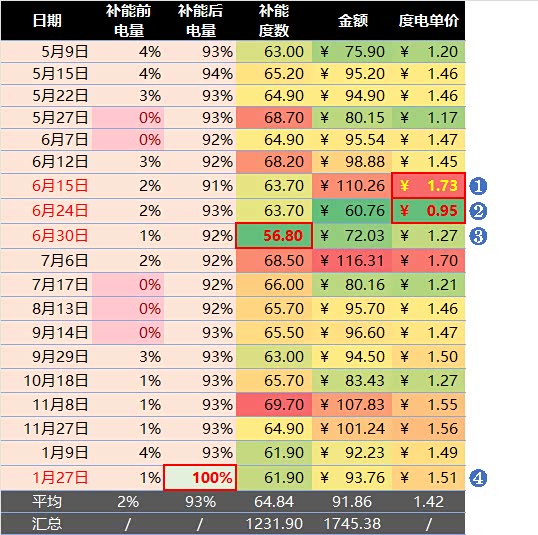 数据显示,我习惯将电量压榨至极限:44%的都把电池跑到了1%以下,有五次达到0%(并没出“小乌龟”)。蔚来锁电藏电有点多,很多车友说天气情况好表显双零后还能跑10-20km,不过我没敢挑战过这种极限。19次换电平均补能64.8度,单次成本91.6元(实付0元),度电均价1.41元,与超充高峰价格基本持平。