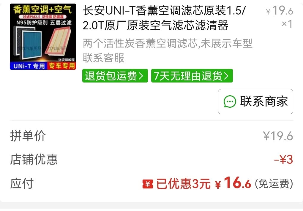 俗话说“工欲善其事,必先利其器”。我直接在线上平台搜索了UNI-T专用的空调滤芯,最终花了16.6元买了两个PM2.5活性炭滤芯,还包邮!这价格在4S店连零头都不到。选择活性炭滤芯是因为它不仅能过滤灰尘、花粉,还能吸附异味,对于提升车内空气质量效果更好。
