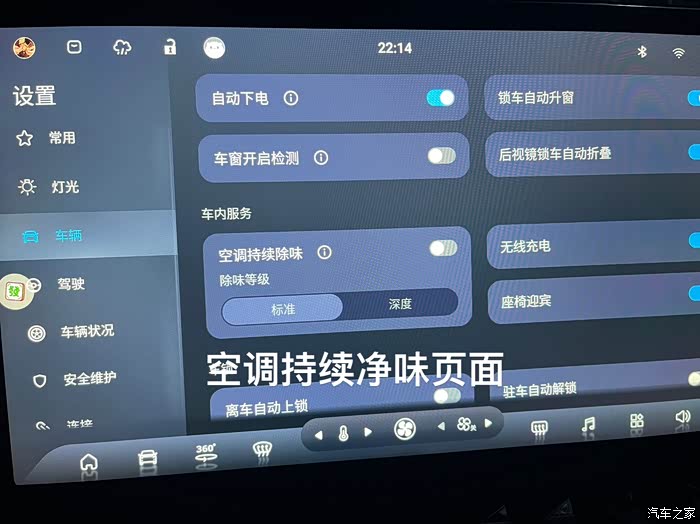 3.增加了空调持续除味功能 很多人觉得是不是拥有香氛系统的顶配pro+才有这个功能 不是这么一回事哦 我是pro版本 依旧有这一项功能 介绍里说是制冷设定温度与环境温度相近 压缩机会保持工作减少起停 从而抑制异味 然后鼓风机也会保持运行 以保持蒸发器和风道干燥 不过这个功能会增加耗电 谨慎开启