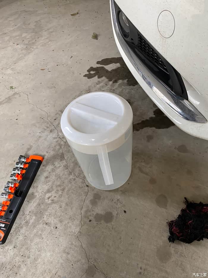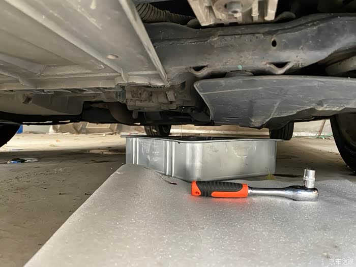 由于第一次换油用千斤顶把车顶起来着实很费时费力,所以这一次采用平地换油,之前买了个接油盆准备换机油用的,但是换机油没用到,换变速箱油倒用到了,前阵子就试了下,把接油盆放到变速箱放油螺丝下面,然后人躺在车头手能够到变速箱螺丝,那这样就方便多了!开干开干!!!