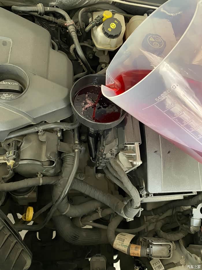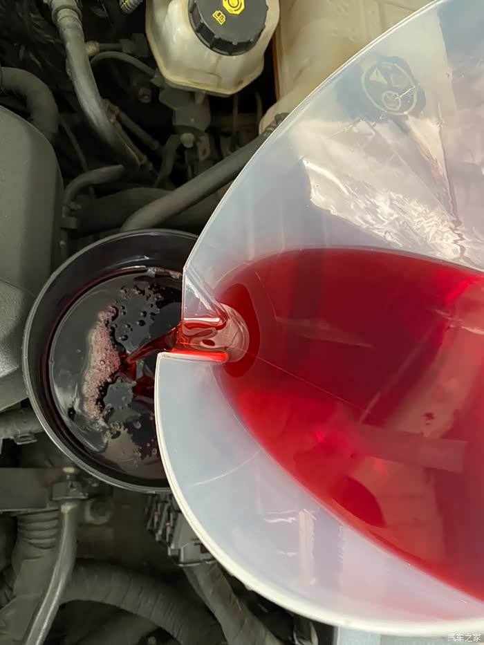 然后把接油盆的油倒入量杯,(这里没有照片,手比较油)此时接油盆有一定量的挂壁,实际油量会比量杯的略多一点点,包括晚点加油的时候量杯也会有挂壁,所以加的时候要略微多加一点。