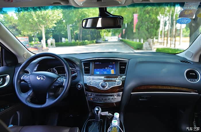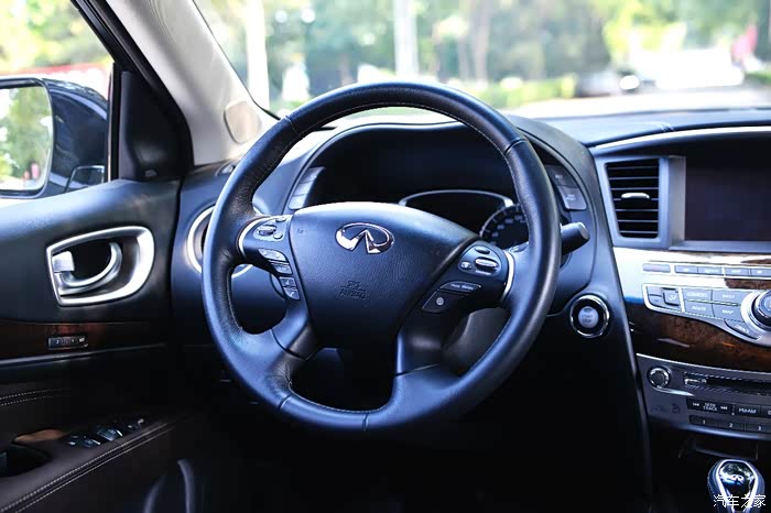 说到QX60的内饰,我想说其实英菲尼迪最擅长的就是营造内饰的豪华感,我接到的这辆试驾车是黑色内饰搭配木纹饰条的点缀,显得很精致,即低调,也有内涵。多功能方向盘的手感也非常不错,而且这个车的方向盘要比一般家用SUV的方向盘大一些,但他与丰田皇冠和雷克萨斯比起来,就稍微小了一些。不过这个方向盘配备了电动调节、方向盘记忆,方向盘加热等功能,握感也很舒服。