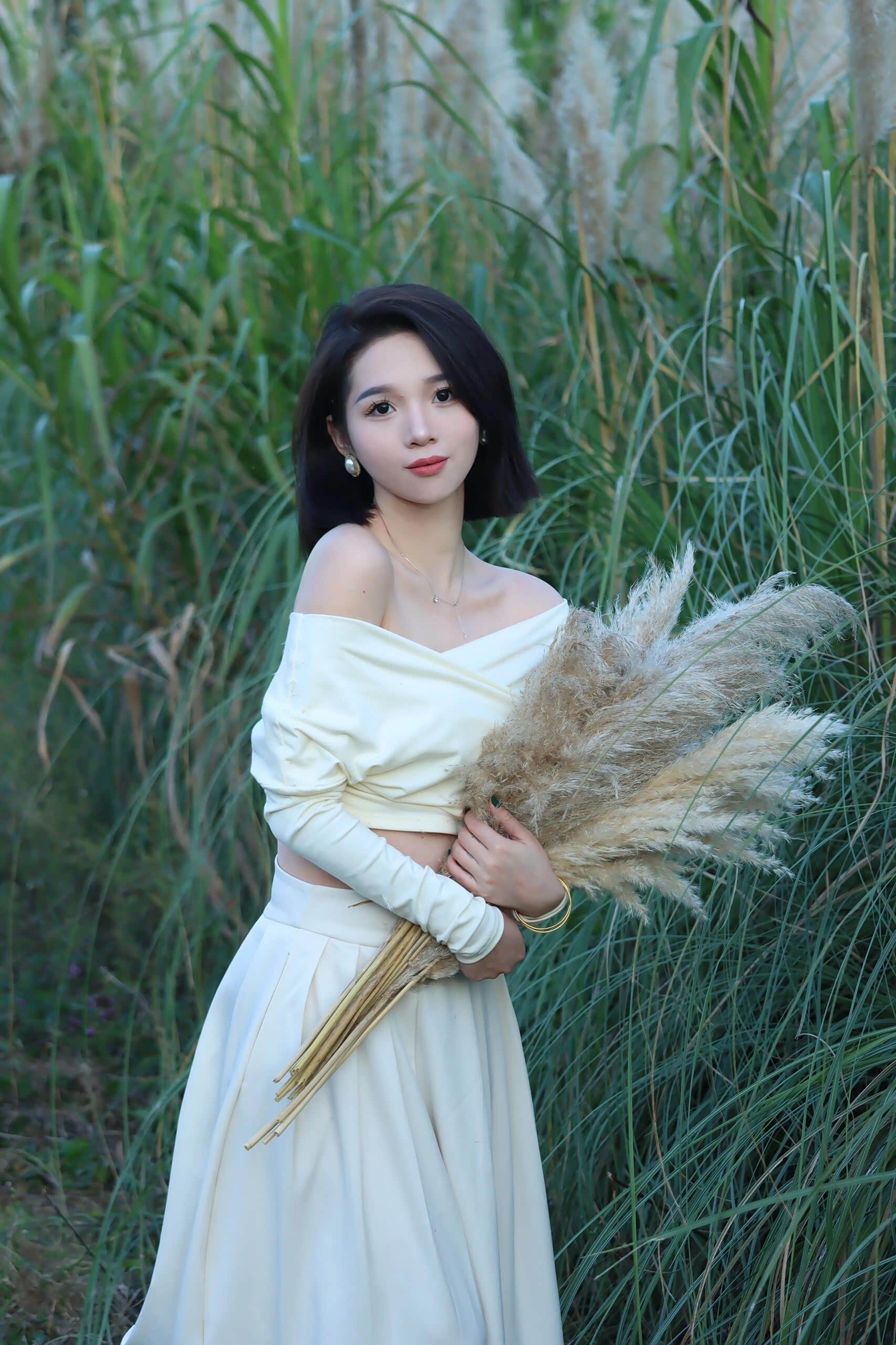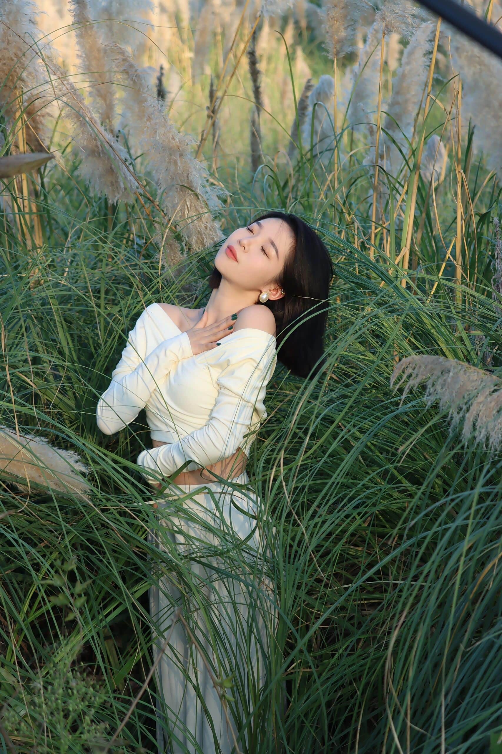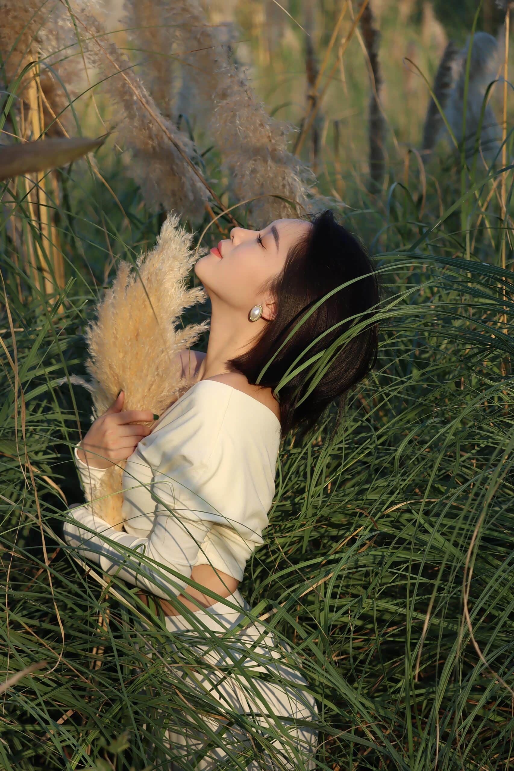 - 互动式姿态:让模特手持芦苇花束,或轻触、或环抱、或举过头顶,让人与芦苇的互动成为情绪的延伸。当她将芦苇花束举向天空时,舒展的肢体是对自由的向往;当她把花束贴在脸颊时,亲昵的动作是对这片自然的眷恋。