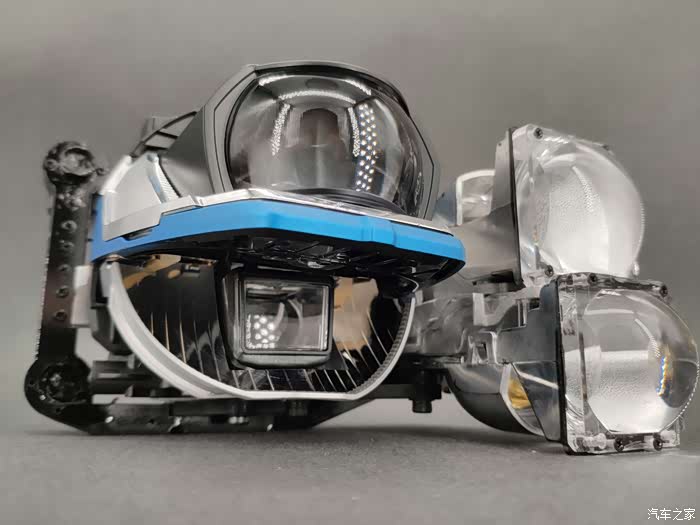 宝马主灯的体积比较大,灯体上只有散热片,没有主动的散热风扇。宝马主灯的设计也比较有意思,近光、远光、激光的焦点可以随意调节,不像一般的双光透镜,远近光灯型位置是固定的。