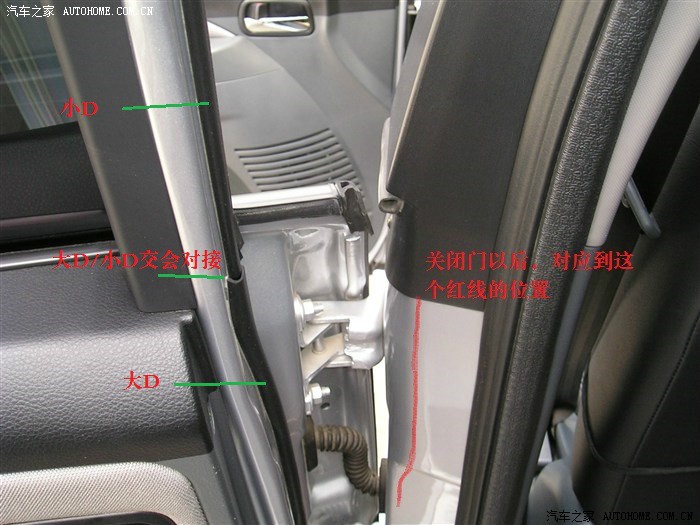 第二步、前门靠近车头的部位贴大D,千万不要挨着门的最外面贴,比A柱(图中画红线地方)的宽度大概少1公分左右。这个尺寸不太好测量,我在贴之前,用纸板剪个模型,结果门缝窄,不好用。可以坐在座位上,多关几次门,就找到合适的地方了。这样贴出来以后,可以和A柱形成直压,不易掉落,并且和门框的原车密封条构成2道密封,效果肯定比1道密封要好啊!动手就是要好效果的。