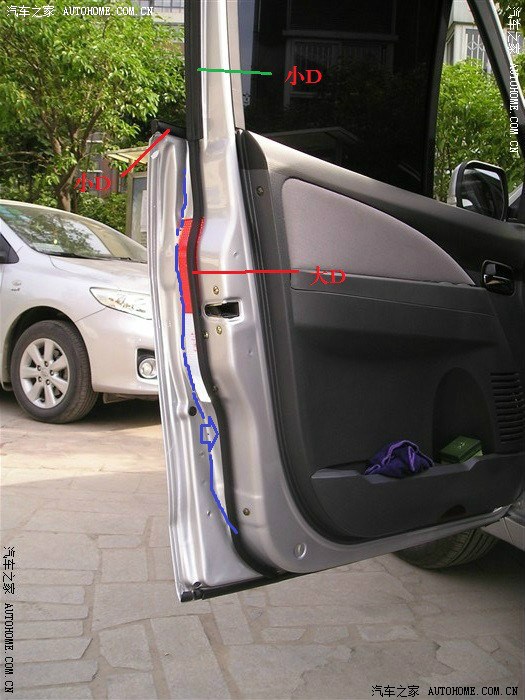 图片中画蓝色线是目前网络上给大家介绍的,我查看了一部分车,是最佳位置,但对景逸的车门来讲,不是最佳位置,贴在蓝色线的位置,基本没有用处。所以,前门车头方向、车尾方向的大D都没有贴在门的最外边。