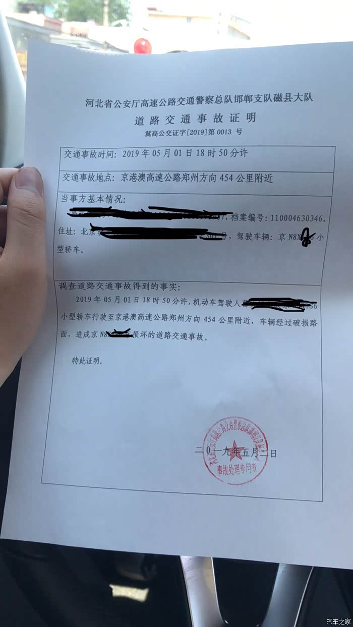 五一小长假自驾不幸高速压坑爆胎,故事曲折,很感谢邯郸庞大之星售后孟经理、冯经理的耐心服务,让我挽回了损失。五一小长假,本打算踏踏实实在家休息,但五一当天还是没按耐住长草的内心,和女友从北京自驾林州去太行峡谷,中午十一点左右出发,晚上行驶过邯郸在京港澳高速454公里附近,由第二车道变第三车道时,发现前方路面有一块黑色补丁,车速120左右。但距离10米左右发现是一个深度7 8厘米 直径20厘米左右深坑,当时来不及反应,右前轮压进坑里,冲击力很大,右前车头明显跳起,油箱盖居然都被巨大冲击力弹开了,当时以为没事就没及时停车往前又走了一小段发现有哒哒哒的声音于是感觉爆胎了。应急车道停车 下车发现右前轮爆胎,由于第一次出交通事故心里有点儿慌,不知道怎么处理,外加那叫一个心疼,生怕撞出别的毛病。