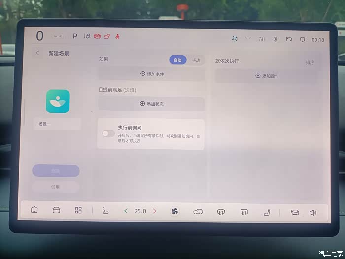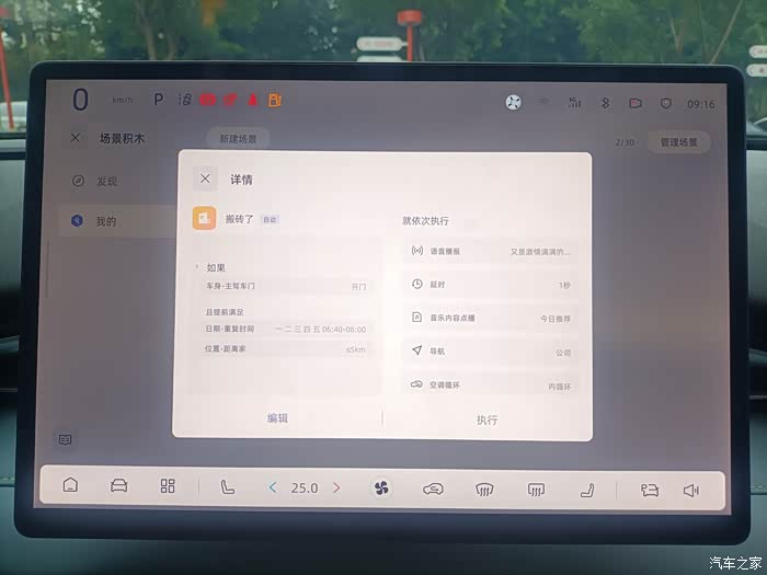 2、场景积木。这个功能就是拿来“编程”的,当然也没有真正意义上编程的繁琐。逻辑是:当满足什么条件或者同时满足什么条件,汽车做出什么反应。打个比方,当时间在星期一至星期五的上午6-9点,距离家≤2km,档位调至D档时,会有如下动作:“又是激情满满的一天,开车注意安全哦!”(可以设置内容),导航到公司XX,播放音乐 XX,开启内循环……这个功能个人认为一方面提供了情绪价值,另一方面用车更加便捷。其实有考虑将上面提到的保安检查车辆的过程编制一个。