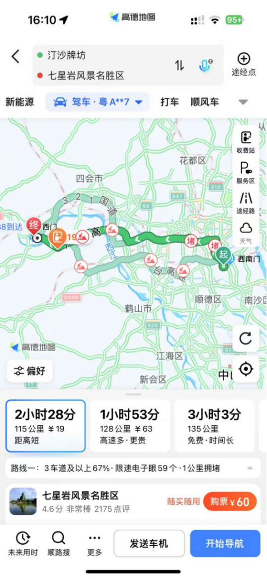 返程,周日下午路线:鼎湖山→广州番禺,全程约124km,耗时约2小时,可以考虑下午3-4左右点出发,就能避开周末出游返程高峰,早点回到广州还能帮女朋友把王者失败的战绩抢救一下。