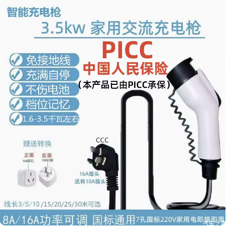 这款充电枪的基本原理就是一头直接用空调插座供电(16A),另一头在充电枪处,加入了一个控制器,实现充电桩与车的通信,居然还可以调节功率。