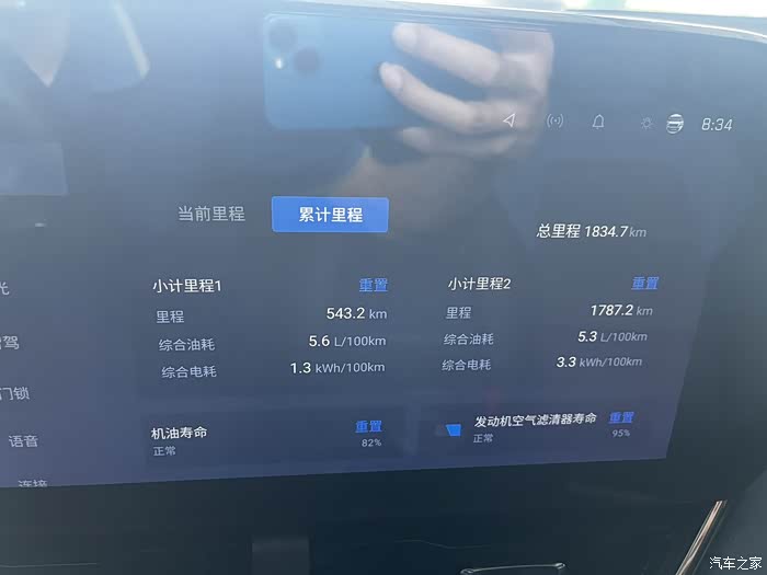 加速时,会以混动模式运行,注意看,行驶了大概几十公里,纯油的续航没有减少,反而增加了十几公里,因为在上高速前有一个十几公里的下道 ,车速慢,油耗较低