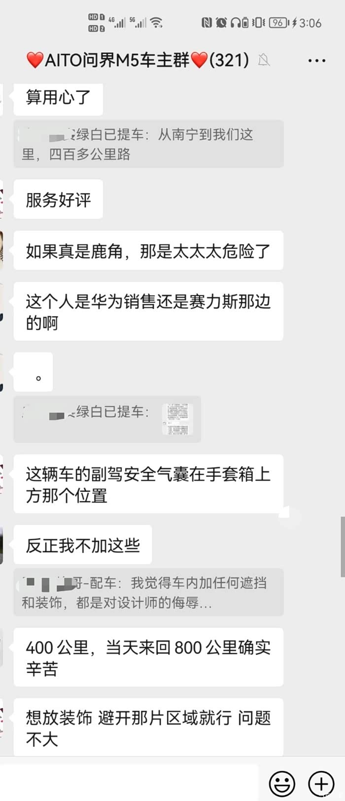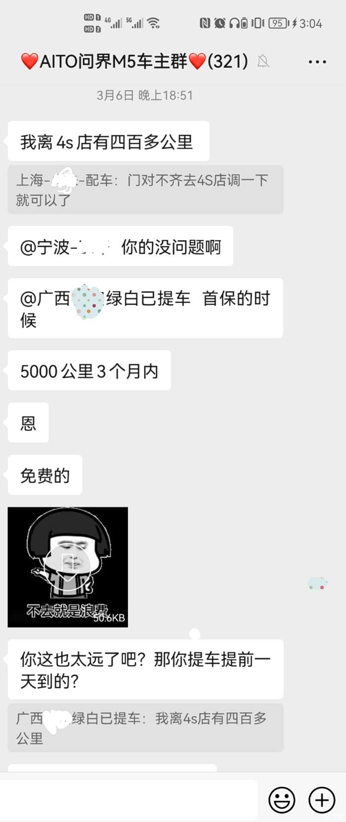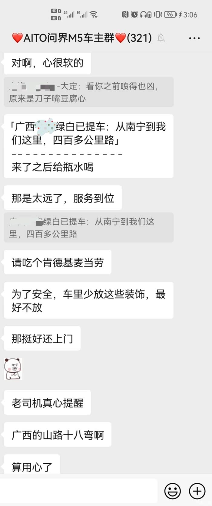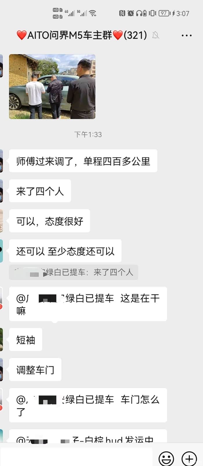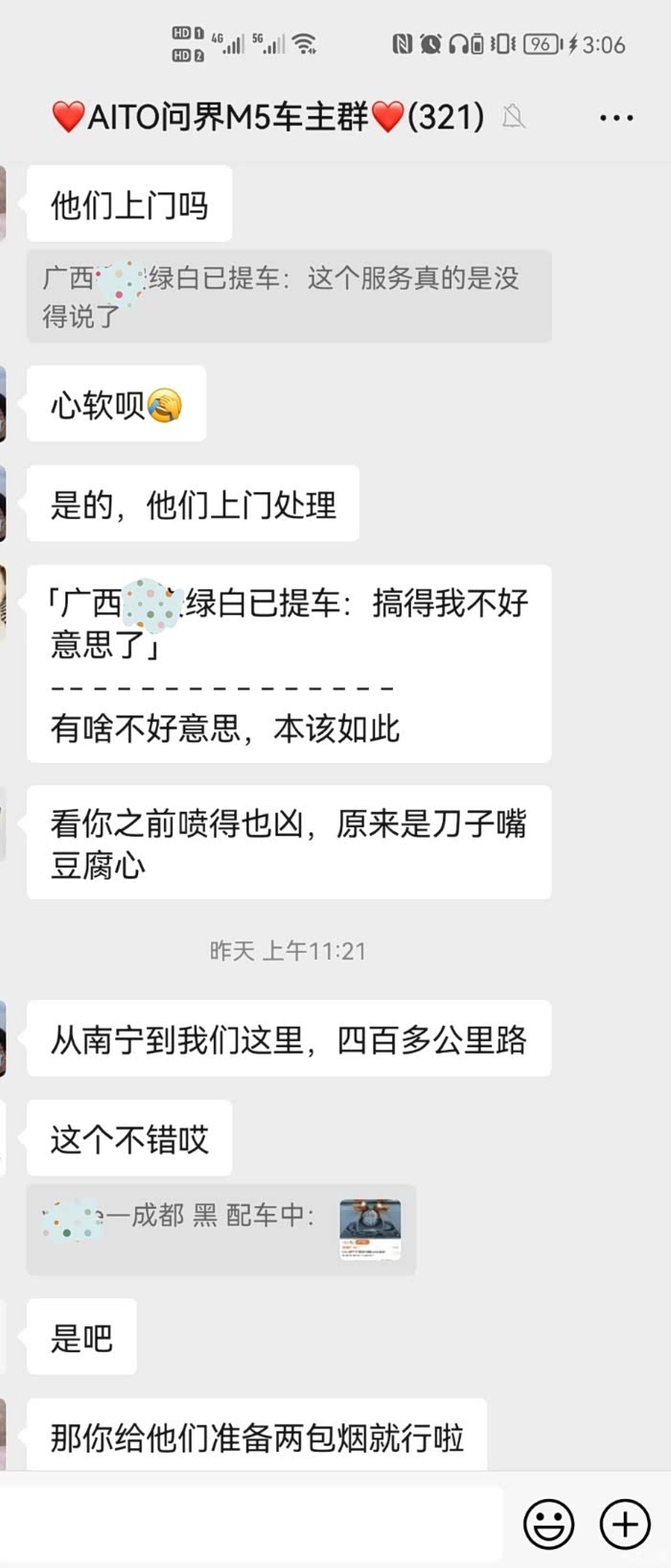 ——车友群人数虽不多,但群策群力足够团结,这也是建群的初衷,五湖四海皆兄弟,遇到问题了想办法解决,互相安慰,事情解决了大家一起开心一起开玩笑。(印象较深的是大家对小艺小艺这个唤醒词的改编,大嘴大嘴可还行?还有三千老哥要直播倒立洗头的梗,还有人开玩笑说眼睛小的人会被疲劳驾驶监测系统频繁提示。余大嘴被群友反复派去拧螺丝,催交车的时候会,华为出现好看宣传片的时候会,今天四个维修人员来帮车友维修的时候又来了,有人说少了这四个人干活,又耽误他们提车进度了,大嘴又被他们派去拧螺丝了,玩笑归玩笑,车友们对余总的信任和崇拜,才让他们对“大嘴”这个称呼那么亲切,开玩笑派他去拧螺丝也见怪不怪了,哈哈)