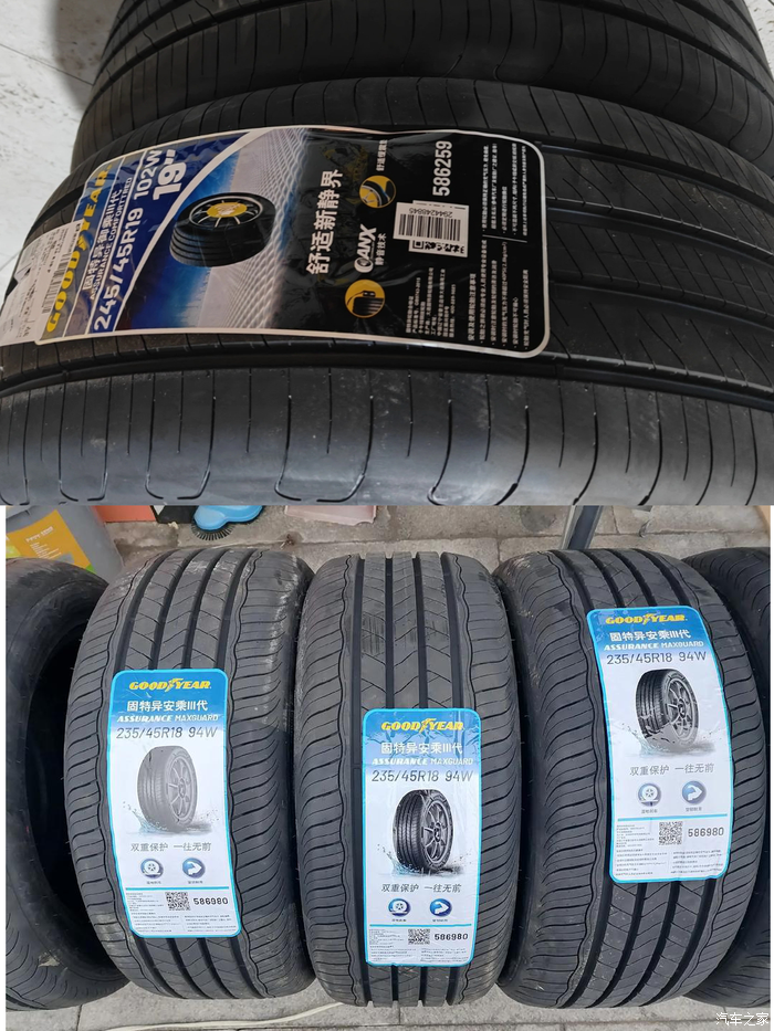 先说说原厂的是245 45 19佳通p10 22年49周轮胎,行驶里程7.6万公里目测还能行驶1万公里左右,原厂轮胎车显电耗12.5-13.9区间,本人开车比较儒雅随和,胎压平时2.5冬天略高2.7 2.8,佳通p10轮胎总体耐磨很强,胎面比较硬路面传递振动比较清晰,干地抓地力也比较够用,湿地下雨天过弯有过几次打滑,还有下雨天慢速过高架收缩缝时候会有像被踢了一脚,去年开始轮胎刹车距离胎噪感觉增长不少可能是老化关系吧,需要以上完全是个人体验感觉。