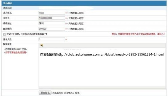 【活动时间】 2013-11-20至2013-11-27 【活动要求】 1、您必须是汽车之家注册会员。 2、在本帖报名前,您必须已经报名了“谁是球王”比赛。 *在本帖报名,只是视作在汽车之家的报名凭证,方便后期抽奖,具体参与“谁是球王”活动信息,网友可前往东风雪铁龙官网下载报名表进行报名。 3、报名网友在参加比赛后需要到活动专题上传比赛证明:如赛场凭证,赛场照片,参赛作业帖等。我们审核过后按照网友参与比赛类别(海选,大区赛,决赛)分别给予奖品激励。 4、上传比赛证明到专题地址。注:上传比赛证明的姓名与手机号必须与在本帖留下的报名信息一致。 【奖项设置】 在本帖报名并参与“谁是球王”比赛的网友, 世嘉车模(20个):汽车之家工作人员从海选赛中随机抽取20名网友获得世嘉车模1个。 尤尼克斯羽毛球拍(10个):进入大区晋级赛的前10名网友获得尤尼克斯羽毛球拍1个。 1000元油卡(5名):进入决赛的前5名网友可获得1000元油卡1张。 【参与方式】 点击“我要报名”,在报名栏里填写正确的个人信息(该信息只有汽车之家工作人员可以看到),以便后期抽奖和邮寄奖品。