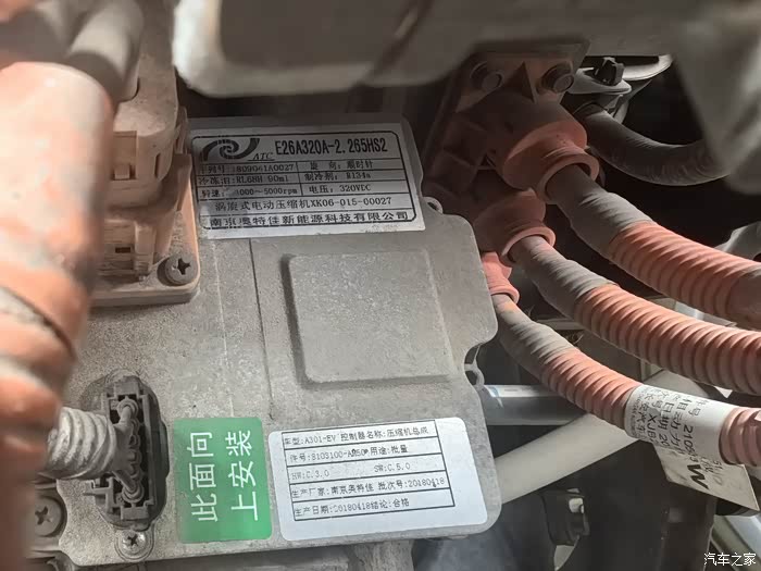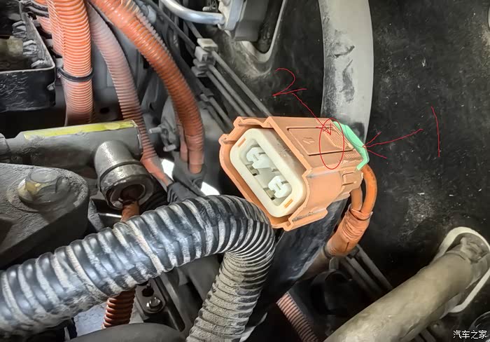 2、来到前机舱,因为压缩机在最里面,且上面有两个插口,橙色是高压,黑色