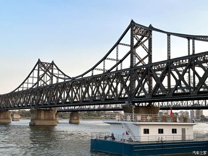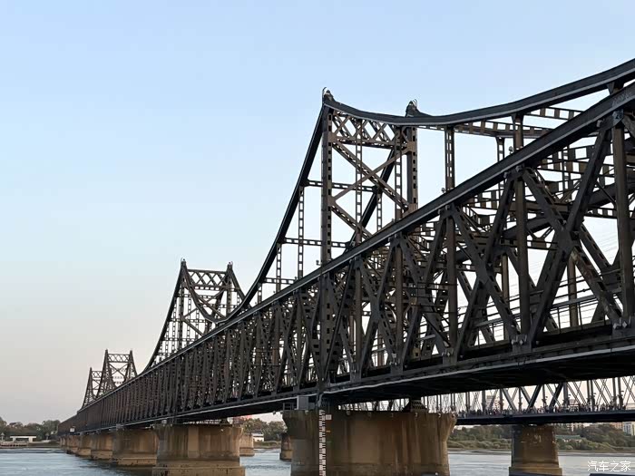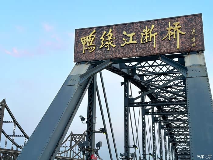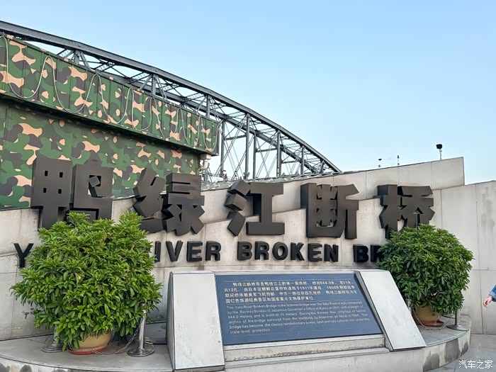 7点10分,我们准时抵达鸭绿江断桥景区。远远望去,这座横跨中朝两国的钢铁桥梁,虽历经战火只剩半截残躯,却依然像一位不屈的战士,矗立在江面上。桥头的「鸭绿江断桥」碑刻被晨光镀上一层金边,江风拂面,似乎还能听见历史的回响。