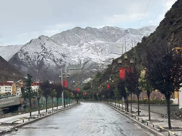 从酒店出来上了县道发现有些不对劲儿,地面上全是水,湿漉漉的。这节气应该不会有人往地上洒水除尘吧?难不成是夜里下雪了?我这还琢磨呢,抬头一看远处山上白茫茫一片,感觉不妙,这夏贡拉山保不齐是没法去了。