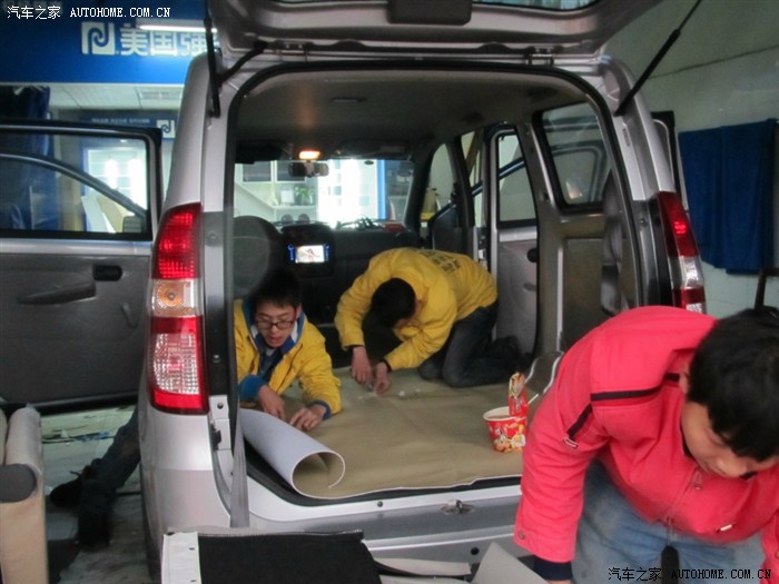装地胶前小赵在用吸尘器清理车内灰尘,空调在旁边观看