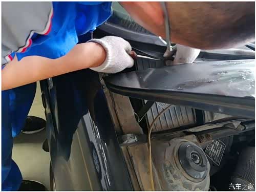 师傅把车子开到工位,然后把引擎盖打开。拆下雨刮器,因为原车的要先拆下来。拆的时候很快,因为毕竟已经破损,就很暴力的拆下了。