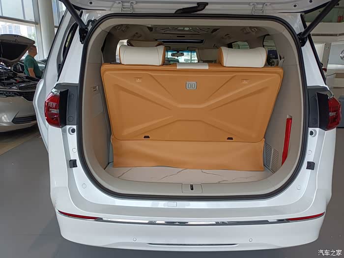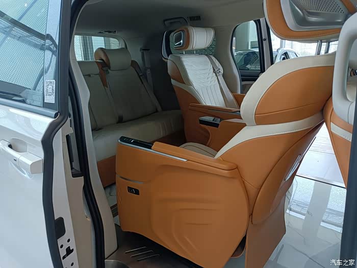 接下来我们看一下他的内饰。四门双层静音玻璃,给您带来图书馆级的静音科技。四幅多功能方向盘,操作方便。快看这里,12.3吋双联屏,提高操作的便利性和行车安全性。可视化车辆控制、自然语音识别、高德实时导航系统、智能手机映射、OTA远程升级、组团出行功能、更多丰富的APP互联应用、安吉星24小时全时在线助理。三门电动开启,也可遥控开启,让来宾尽享尊贵,配智能防夹功能,保护乘员安全。进入车内的阶梯踏板设计,更加贴心实用。第二排豪华贵宾座椅,全包覆式座椅极具雕塑感,加宽扶手带来尊崇感乘坐体验。椅背电动调节,结合6向航空头枕,提供丰富坐姿选择;椅面采用双硬度发泡工艺,表层柔软,底层坚韧,全面配备加热、通风、按摩功能,长途乘坐舒适惬意。豪华翻折小桌板。230V电源输出。第三排空间同样舒适不压抑,考虑车内所有乘员的用车方便性。三区独立空调以及车内遍布的USB充电孔。