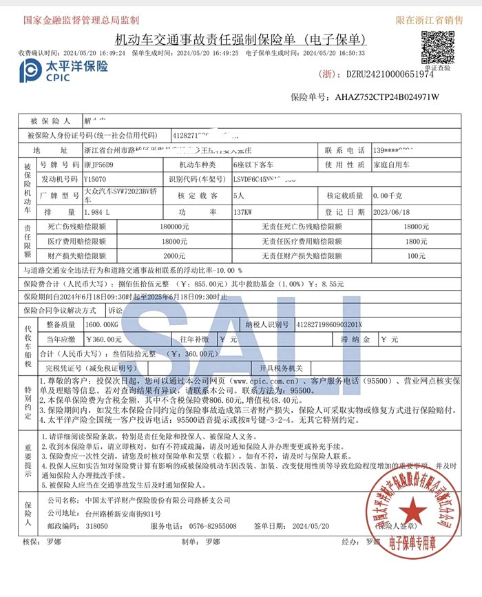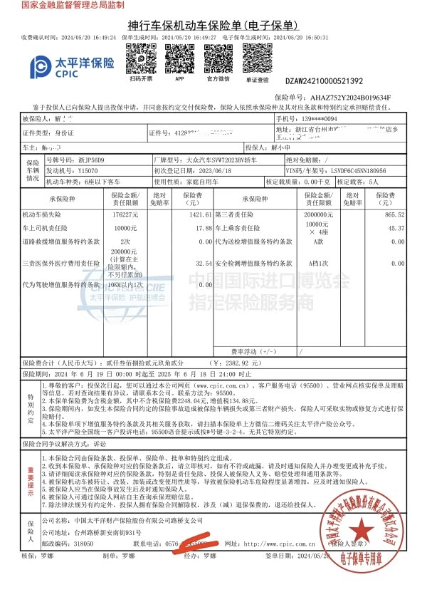 保险购买今年开始只能提前一个月购买了,购买之前建议多选择几家保险公司报价,自仔细统计过之后你就会发现,保险价格还是有差别的。我选择的是太平洋保险,在4s店继续续的保。今年(第二年)的商业险为 2383 元。交强险是必须购买的,费用是 855 元。车船税 360 元。意外险 60 元(绑定产品,如果能谈下来不买最好)。总计保险一年的费用为 3658 元(最后返现了350元加油卡)。