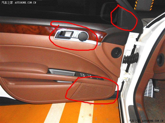 左前门4扬声器:A柱1个、车门开关处1个、车门下方2个