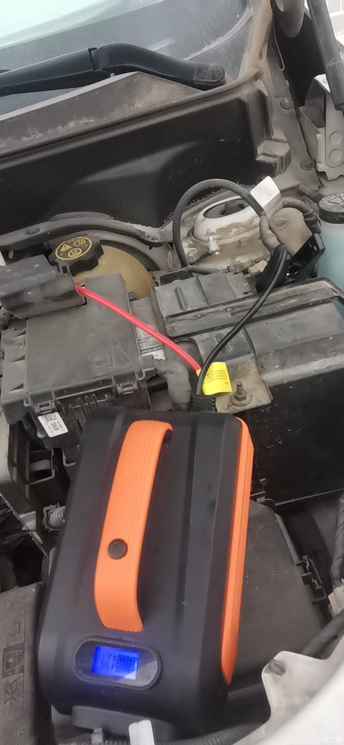 最好用应急启动电源,一头接正极,负极接到车身接线柱上(其实我接到电瓶负极上也打火正常,但是外地车友反映有些车友的电瓶烧了,为了安全起见,建议负极接到车身那个接线柱上)