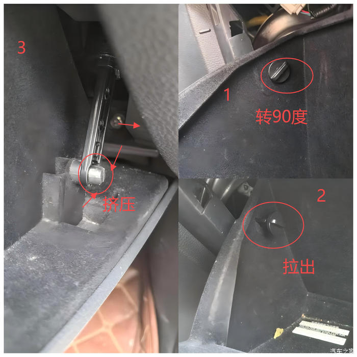 为方便操作,把手套箱的缓冲拉杆也取下来。取缓冲拉杆的时候,一定要小心它的固定卡扣,那里比较薄弱,要小心操作不要掰断了。