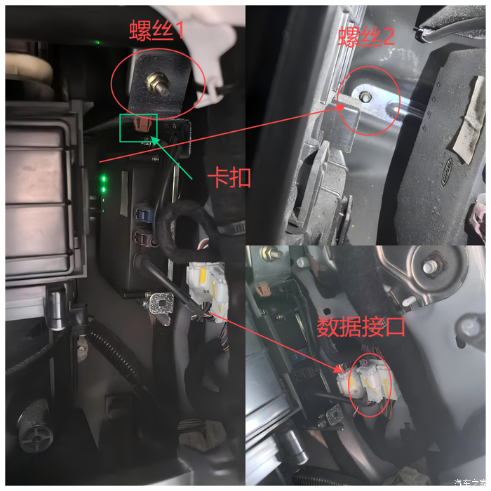 (4)原车的数据线接口跟另一个接线卡扣结合的很紧,最后没办法暴力取下,但是破坏了无法装回去,不过可以最后用扎带固定。