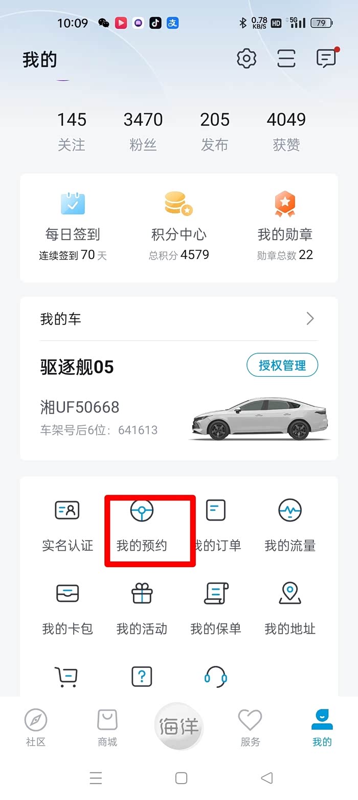 🎯去保养之前,选择了比亚迪的预约服务,不得不说预约服务真是方便,直接到海洋网APP中“我的“一一“我的预约“就可以进行预约服务了。预约成功后比亚迪会发送短信进行提示。