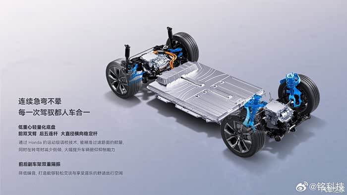 架构平台技术:基于本田云驰智能高效纯电 W 架构打造,具备高刚性、低重心、轻量化特性。长轴距、宽轮距、大尺寸轮胎组合,前后 50:50 配重比与低重心设计,配合高刚性车身,带来顶级驾趣、极致稳定和越级安全性能。车身扭转刚性达 4 万牛?米 / 度,高强度钢占比 68%,热成型钢占比 25%,电池采用 12000 吨一体化压铸全铝外壳,保障车辆安全与性能 。